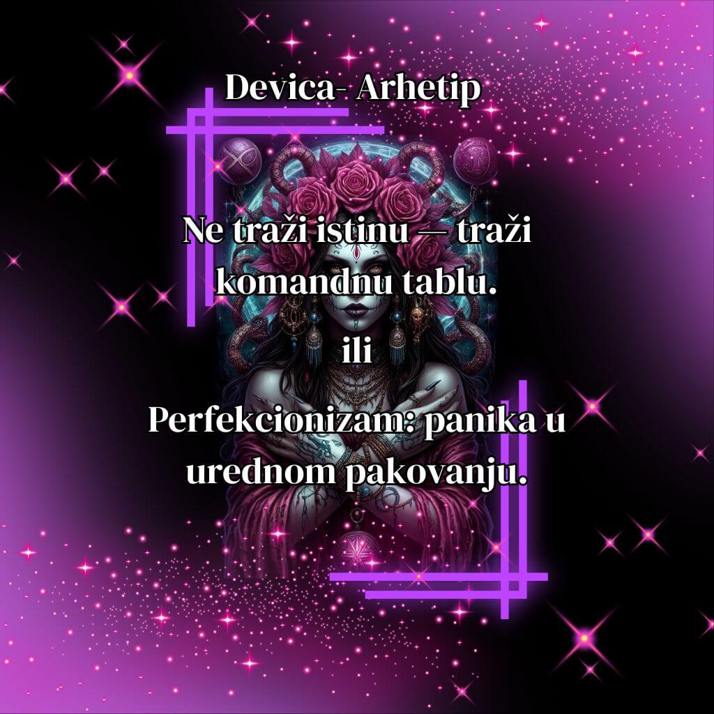 Devica je znak koji se ne prlja. Nikad. Ni kad bi morala. Ona ne ulazi u život, ona ga dezinfikuje. Umesto impulsa – analiza. Umesto želje – korekcija. Njena sveta reč je: „Treba.“ Njeno tajno prokletstvo je: „Ne smem.“